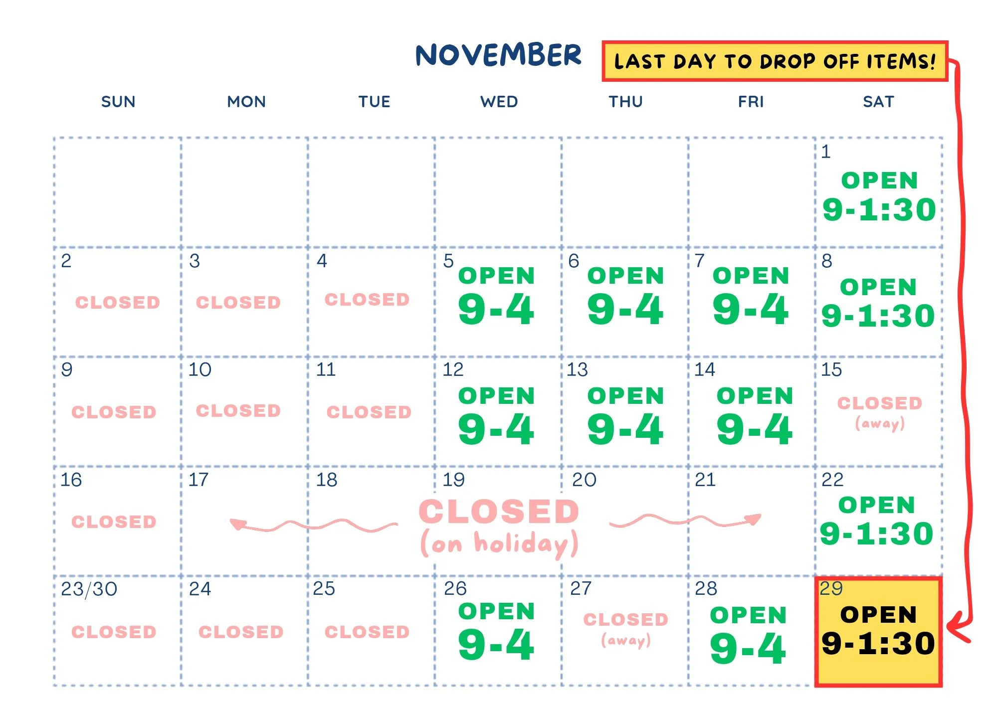 The final day to drop off items will be Saturday 29th November, and the final day to collect items will be 20th December.